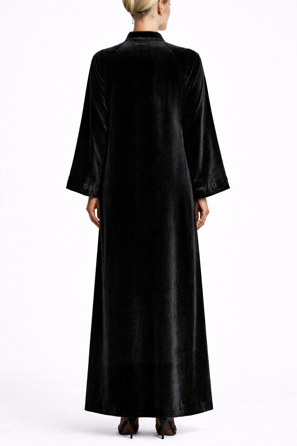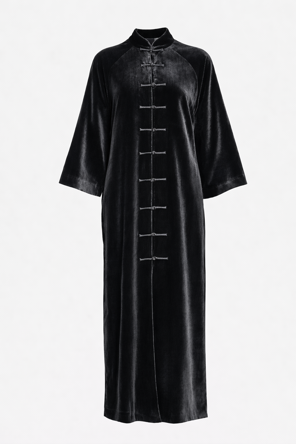A charcoal velvet abaya coat with Chinese inspired detailing.