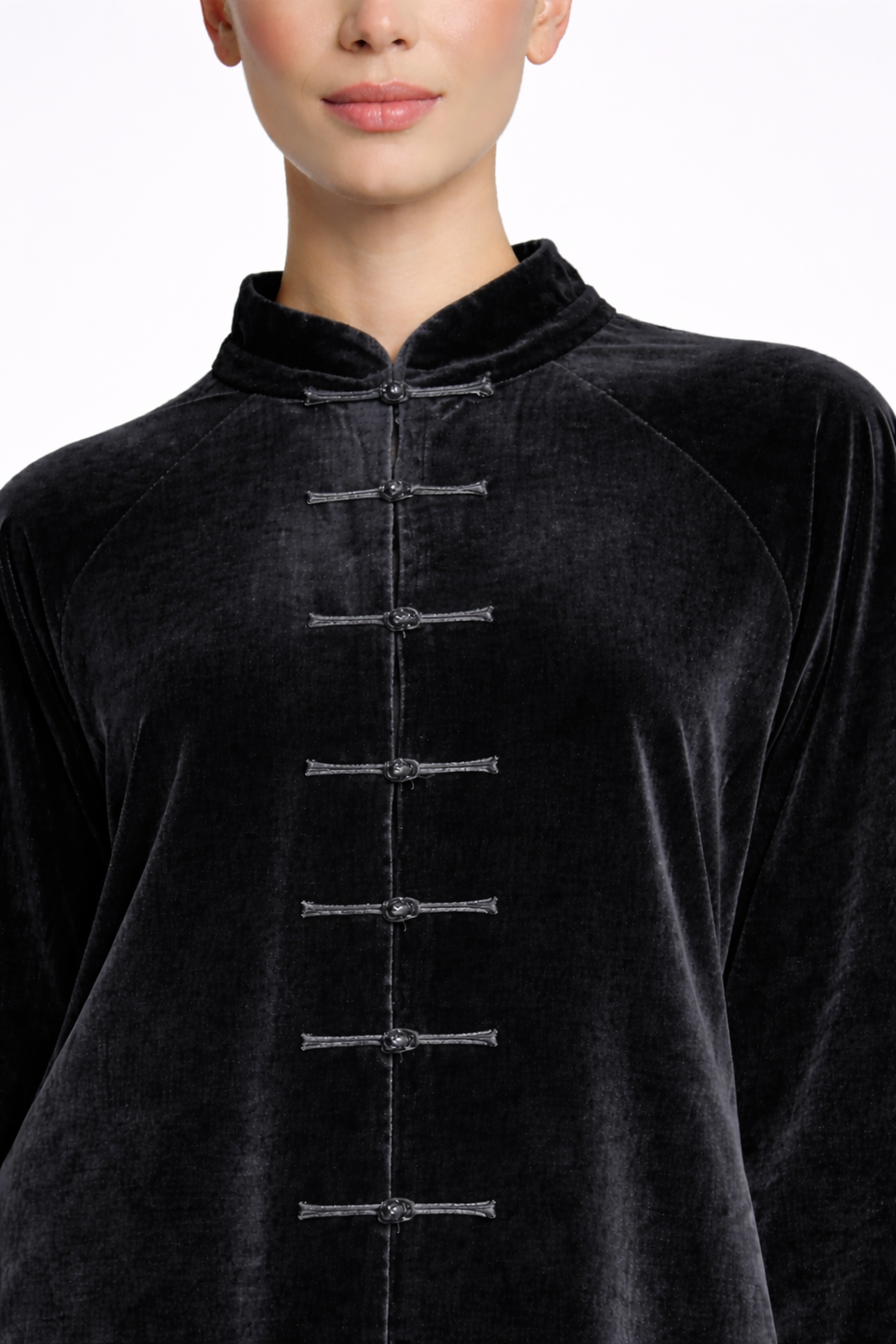 This charcoal velvet abaya coat features a relaxed silhouette with traditional Chinese detailing.