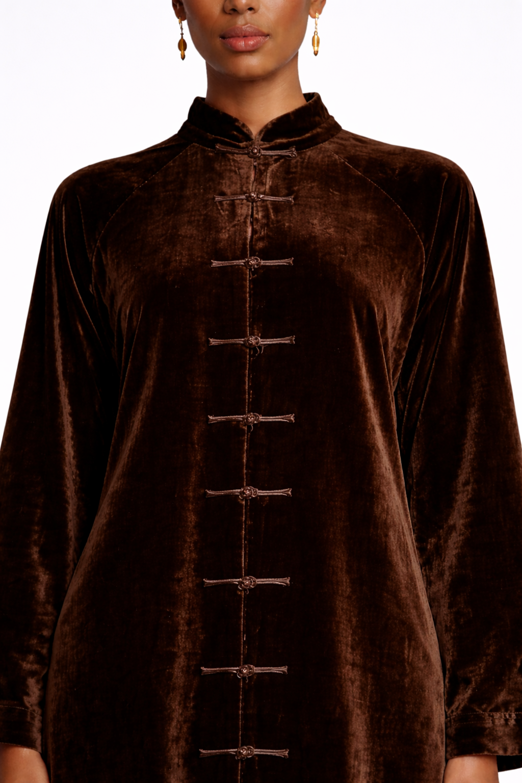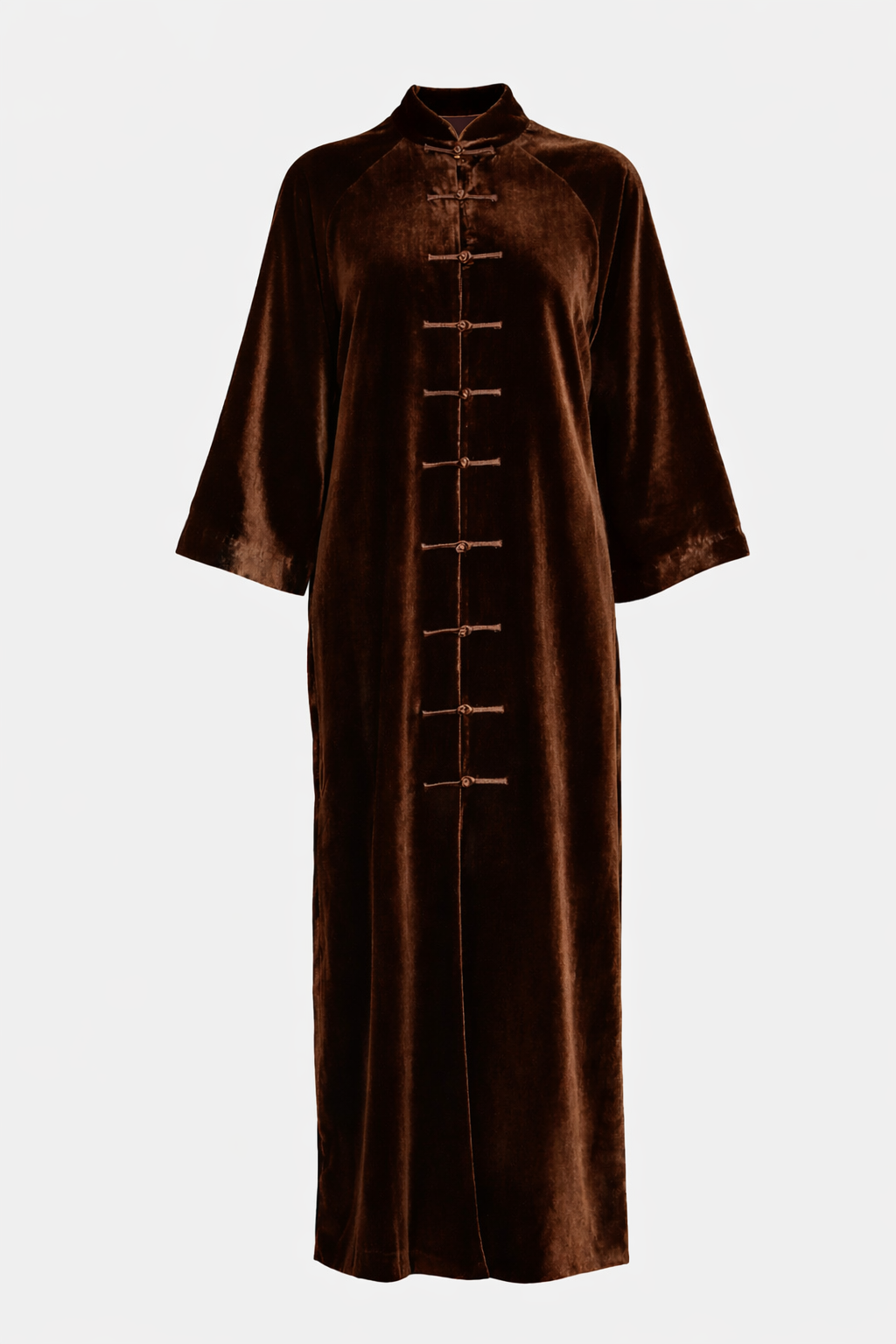 Full length velvet abaya in chocolate brown with traditional Chinese knot buttons and long sleeves. Oversized modest fit designed by height.