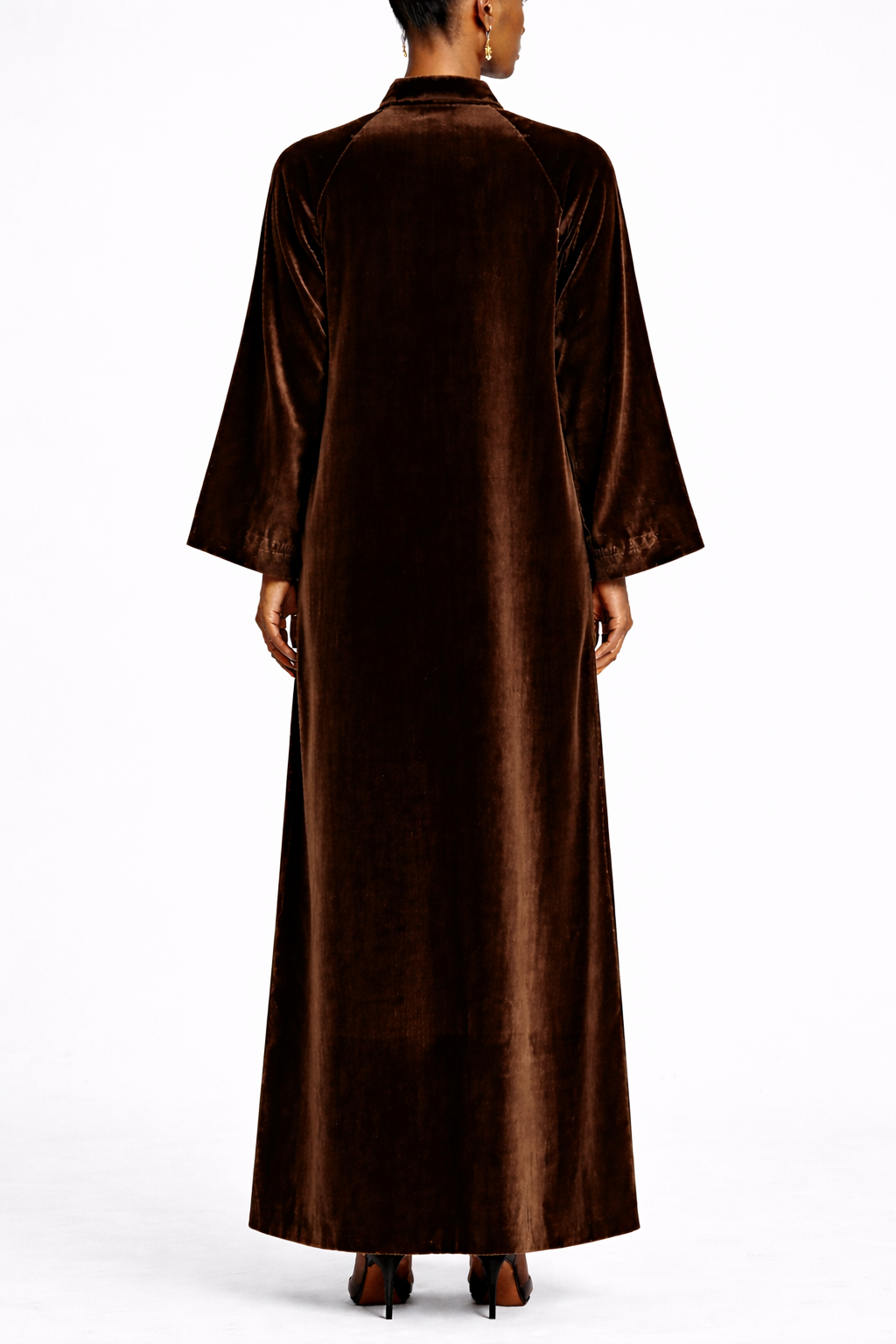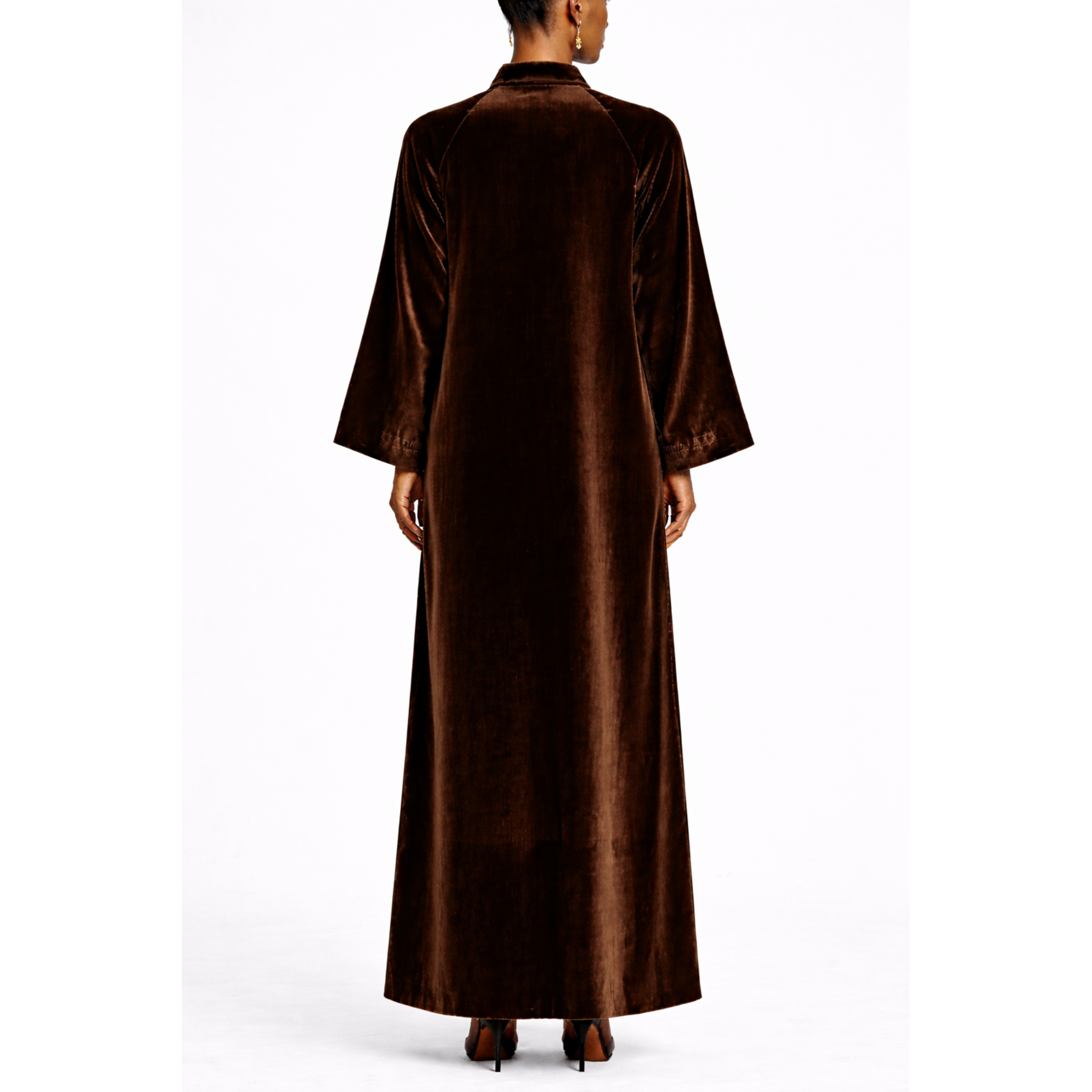 A full length abaya crafted in soft velvet with a rich chocolate brown tone.
